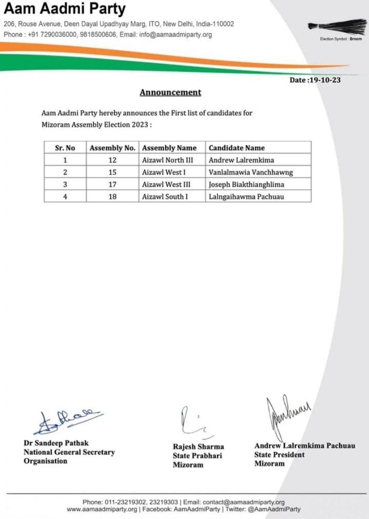 रांची/डेस्कः आगामी दिनों पांच राज्यों में विधानसभा चुनाव होने वाला है. इसे लेकर पार्टियां अब अपने-अपने स्तर पर चुनाव के प्रचार-प्रसार में जुट गई है. इधर, मिजोरम विधानसभा चुनाव को लेकर आम आदमी पार्टी (आप) ने अपने 4 उम्मीदवारों की पहली लिस्ट जारी कर दी है.