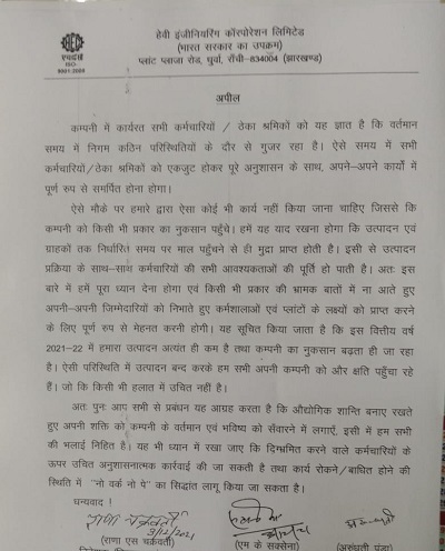 रांची: हेवी इंजीनियरिंग कॉरपोरेशन लिमिटेड, एचईसी प्रबंधन ने कर्मियों के लिए 3 दिसंबर को एक अपील पत्र जारी किया है. निगम प्रबंधन के डायरेक्टर मार्केटिंग राणा एस चक्रवर्ती, डायरेक्टर प्रशनल एमके सक्सेना और डायरेक्टर फाइनांस अरूंधती पांडा ने संयुक्त रूप से अपील किया है.